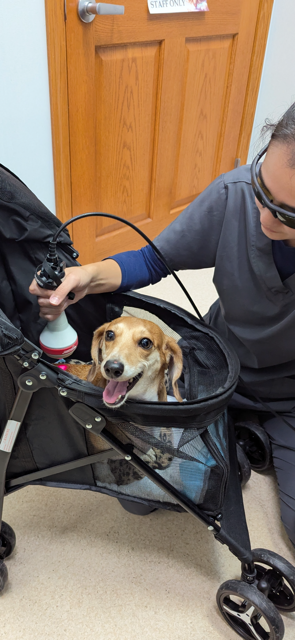 I’m potty pad trained and crate trained, and despite a past back injury, I’ve had laser therapy and am doing well. I’m a little wobbly, but I’m strong and independent.