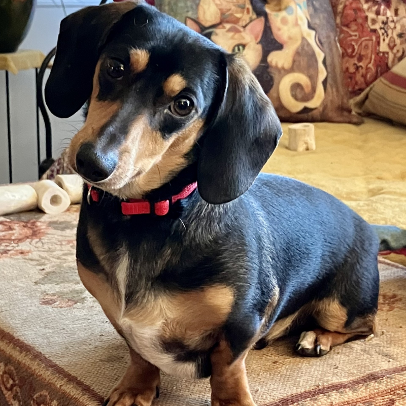 Meet Schatzy…a 15-lb, 21-month old, neutered, black/tan, smooth Dachshund who is looking for his new home. Through no fault of his own, Schatzy has had numerous homes in his short life, so we are going to do our diligence in making sure this next home is his last!